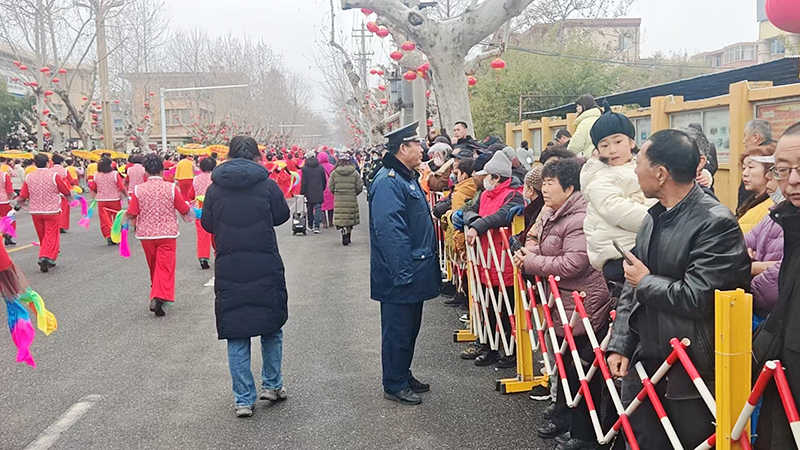 执勤期间,全体队员精神饱满、文明规范,坚守在路口管控、沿线防护、人群疏导等关键点位,耐心引导市民有序观演,及时提醒安全注意事项,积极协助维护现场秩序与道路畅通。大家以严谨细致的作风、认真负责的态度,穿梭在喜庆人群中,用坚守与担当守护现场平安,成为民俗活动中一道可靠的 “安全屏障”。